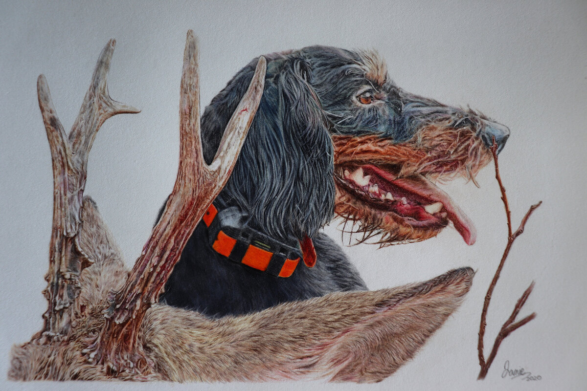 Many of Carmody’s drawings share her combined passions and showcase bird dogs in their moments of glory, retrieving a quarry, or simply enjoying the land. Carmody has since founded Jamie Wild Art to showcase her artwork around the world and she continues to look for ways to give back to conservation through her work.