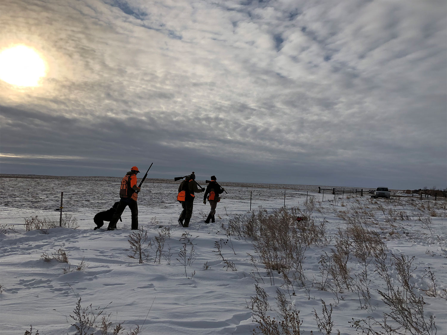 A slow pace works best, and helps keep the birds guessing. Winter roosters circle, sneak and skulk around you and your dog. Slowing down gives the dog more chance to work, and makes roosters fidgety; maybe fidgety enough to hunker in for a point or flush.